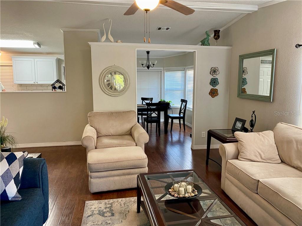 Immaculate home with all new updates. Some of the features include: Mostly new thermal pane windows throughout; New roof in 2014; New A/C 2016; all freshly painted with neutral colors; Dry wall package; knockdown ceilings in kitchen, dining, living, hallway; new ceilings in both bedrooms and baths; crown molding; new appliances in 2014; all new cabinets in kitchen & bathrooms; granite countertops in kitchen in 2020 and bathroom cabinets are counter height; all new wood laminate flooring in dining room, living room, hallway; all new vinyl flooring in kitchen, bathrooms, and lanai, (lanai is equipped with central HVAC adding extra square footage not listed in public records); all new carpeting in bedrooms; new interior doors; washer/dryer in 2015; new deck with steps on each side leading into the beautifully landscaped corner lot complete with curbing around the shrubbery; set in a cul-de-sac, new garage door screen; even the garage has been drywalled and freshly painted. There is nothing to do in this home except move in and start enjoying your life in the Plantation at Leesburg. Whether you like to golf, play tennis, pickleball;, shuffleboard, bocce, fish, horseshoes, play softball, swim, play pool, cards, or inside activities, you can do it all in the Plantation at Leesburg. A 55+ community located in central Florida and just a short drive to the attractions or the beaches. On a clear day, you can even see the shuttles or rockets take off from your own property. There are two exercise rooms, a fishing pier, a walking path, three clubhouses, a restaurant and just a short golf cart drive away to a diner, cigar lounge, nightly entertainment, and even a walk in medical clinic and a place of worship. Make an appointment to see this gorgeous home today. You will want to make it your own.
