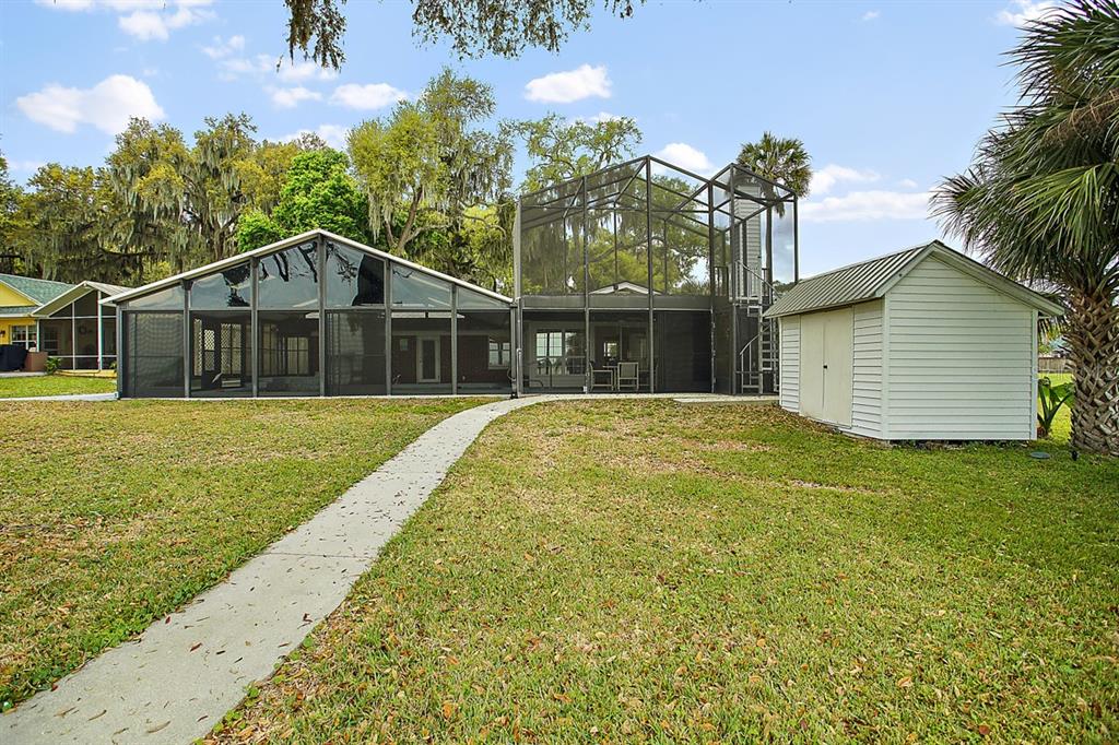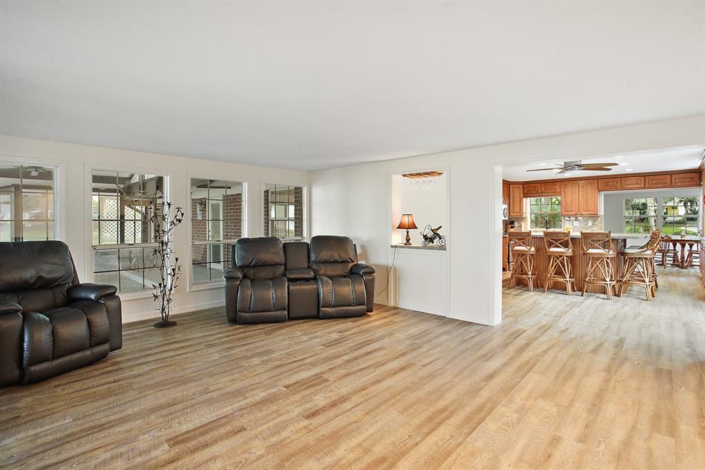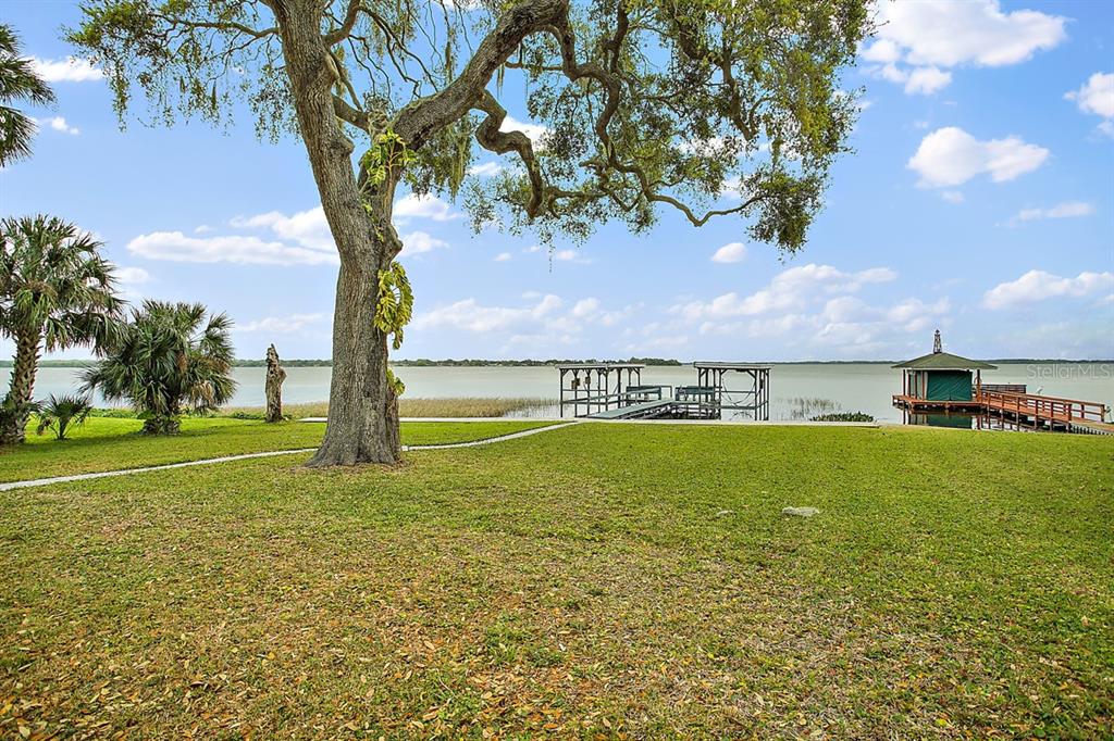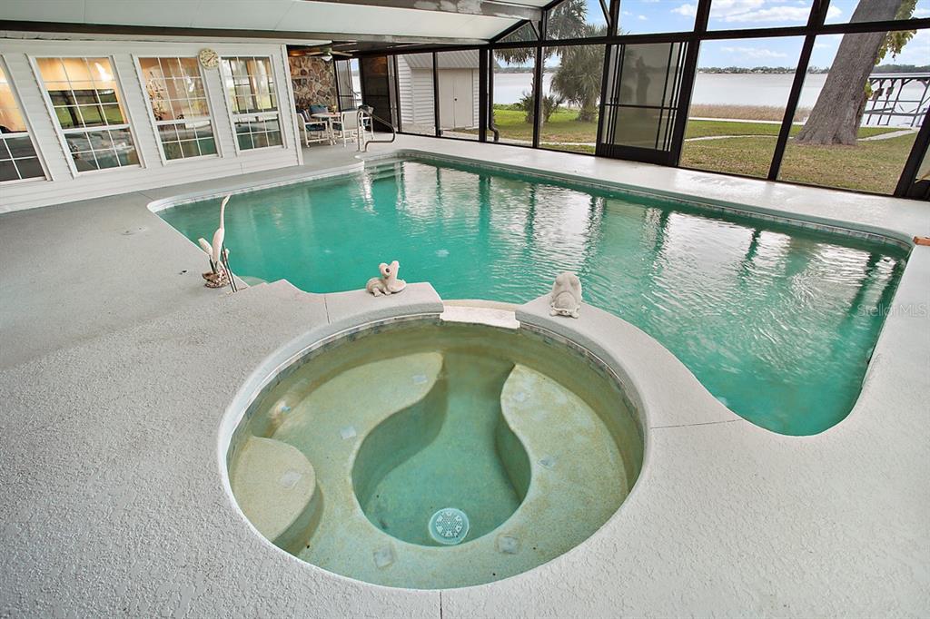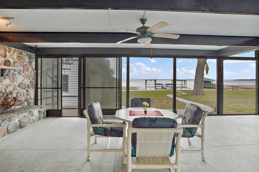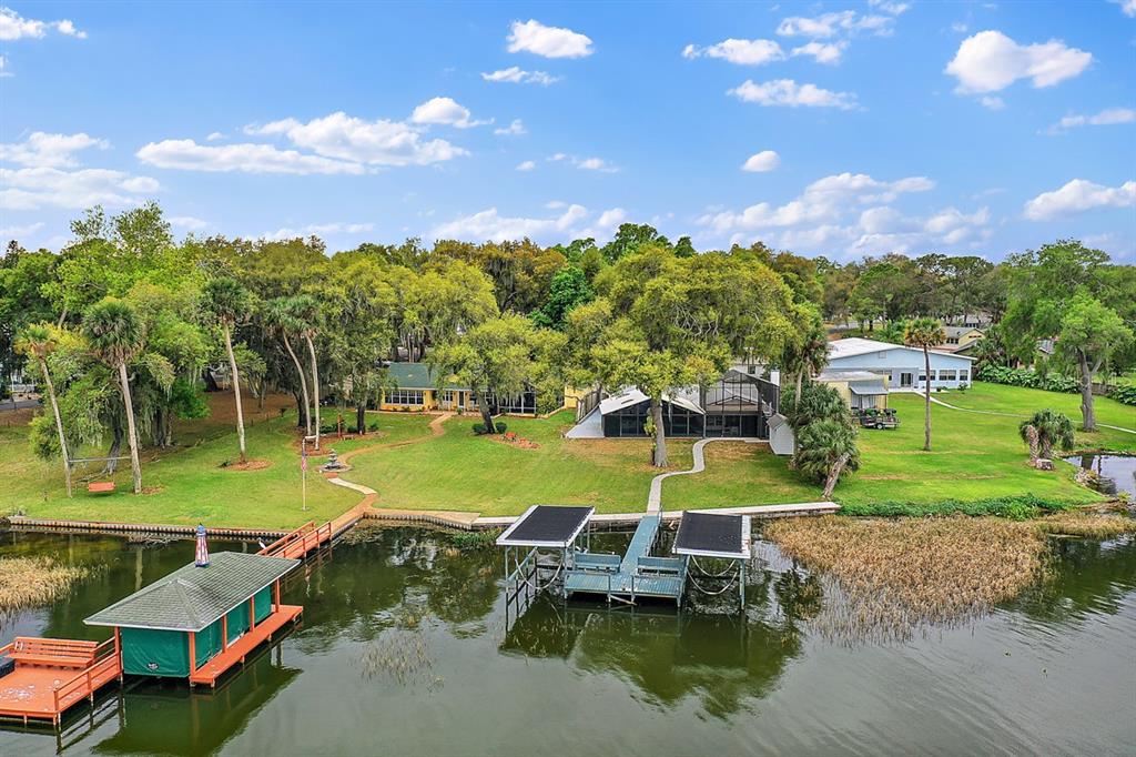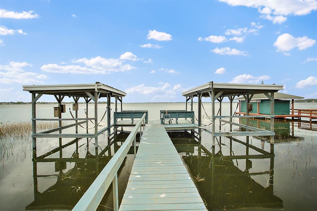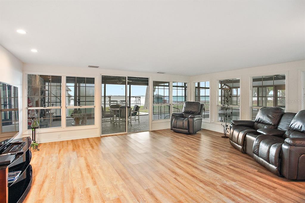 Calling all Boaters and Entertainers! Come watch the sun rise over Lake Griffin at your 2 bedroom 2 bath Lakefront Retreat on the Harris Chain. Boasting Dual Boatlifts, an enormous enclosed pool area with spa, and almost everything new in 2017, this home is a find. Walking in, you will be greeted by open, flowing living areas, panoramic lake views, and natural light pouring in over matching vinyl plank flooring throughout the bulk of the home. The kitchen has custom built Alder wood cabinets with slide out drawers and spice racks along with countertop and interior cabinet lighting. A huge island is perfect for entertaining, food prep or just extra seating. To the rear of the open kitchen is a large family room addition with recessed lighting and tons of windows to let in the outside living area and lake views. The master bedroom lies at the end of the South side of the home and shares pool / lake views with the guest bedroom just before. The master bedroom also hosts a private office with sliding rear exit and a utility room just off of that. Just outside is a Huge outdoor living space with fireplace. A large screen room with vinyl sliding windows is covered by insulated aluminum panels with skylights all over a large in ground pool with spa connected. This leads up to a 21’x15′ screened rooftop patio that gives phenomenal lake and sunrise views. Other bonuses include a detached two car garage, large circular driveway, new fence in ’22 on the North side of property, new roof and on demand water heater in 2017. The Ocklawaha River is just at the North Tip of Lake Griffin and can be taken to Silver Springs, St Johns, The Atlantic Ocean, and Lake Harris is a short boat ride through Haines Creek and the locks to the East. Great central Leesburg location and only a short car ride to The Villages, I-75, LRMC and downtown Leesburg. Come take a look today while this lasts!