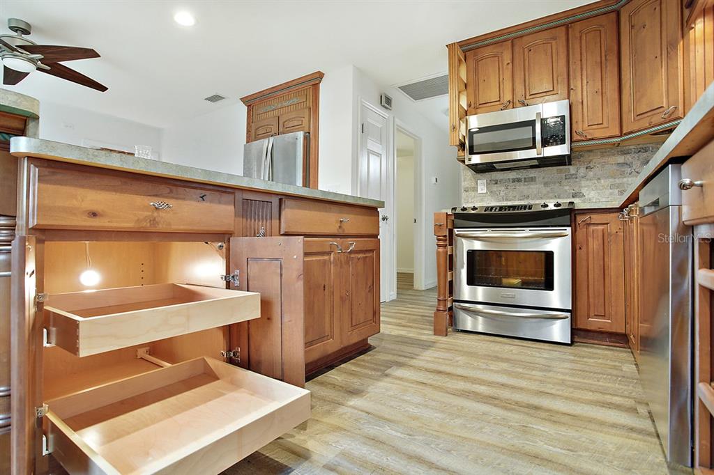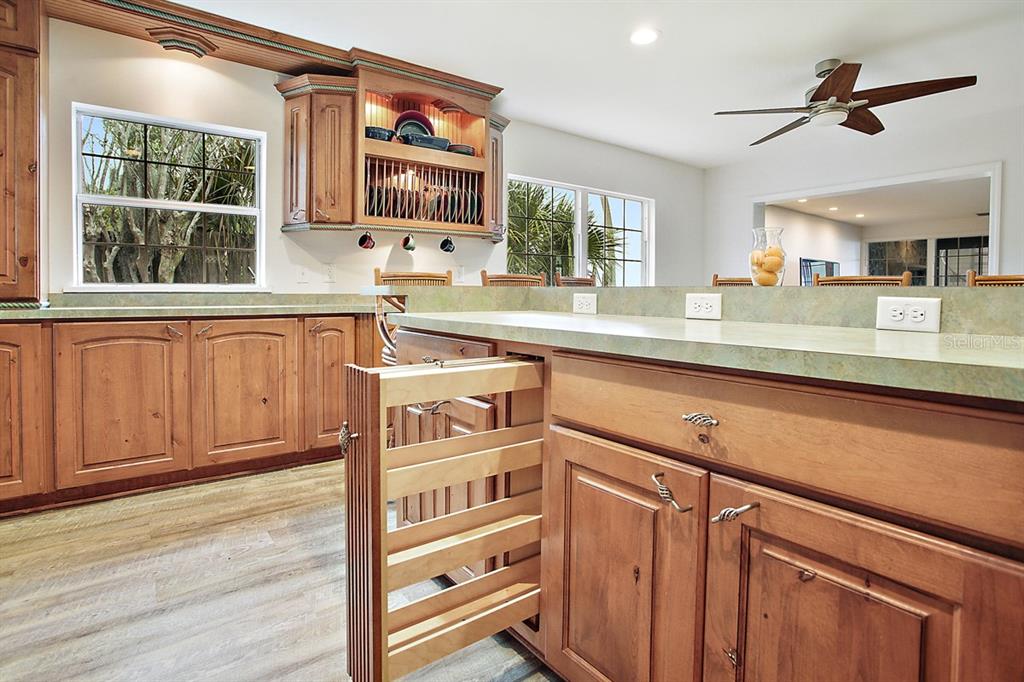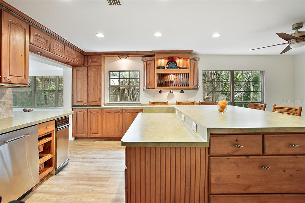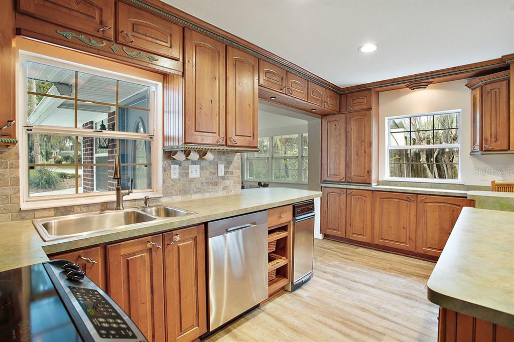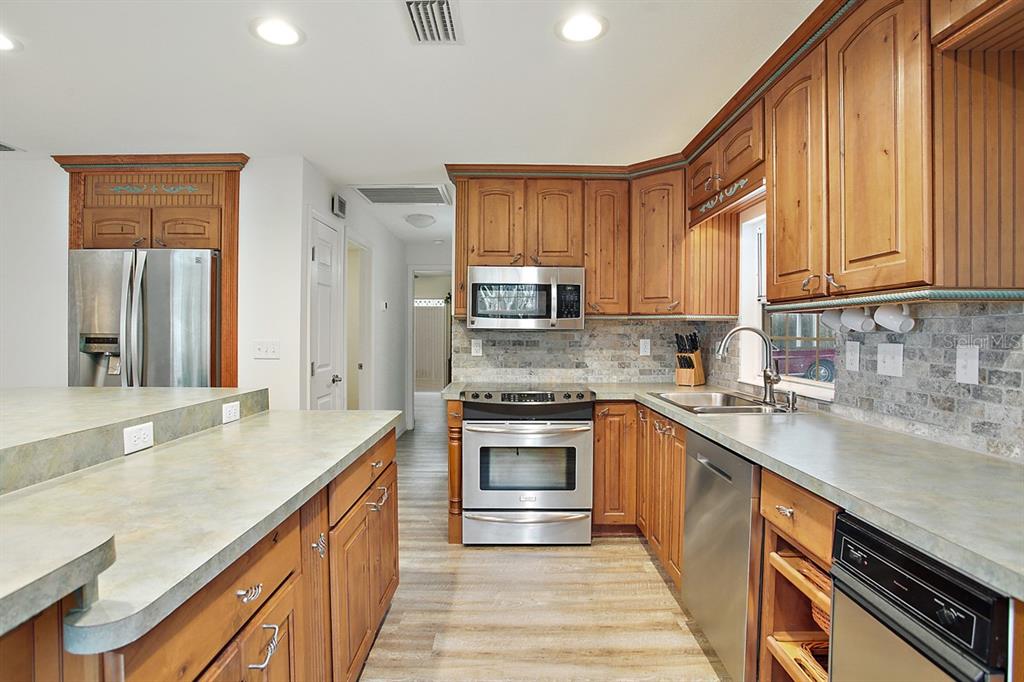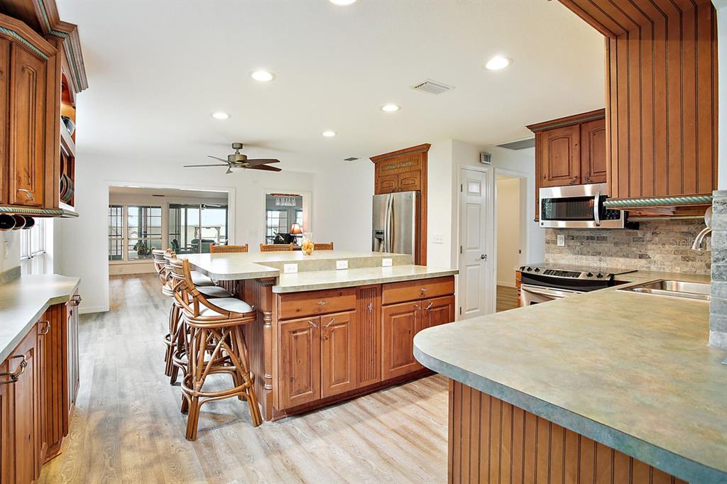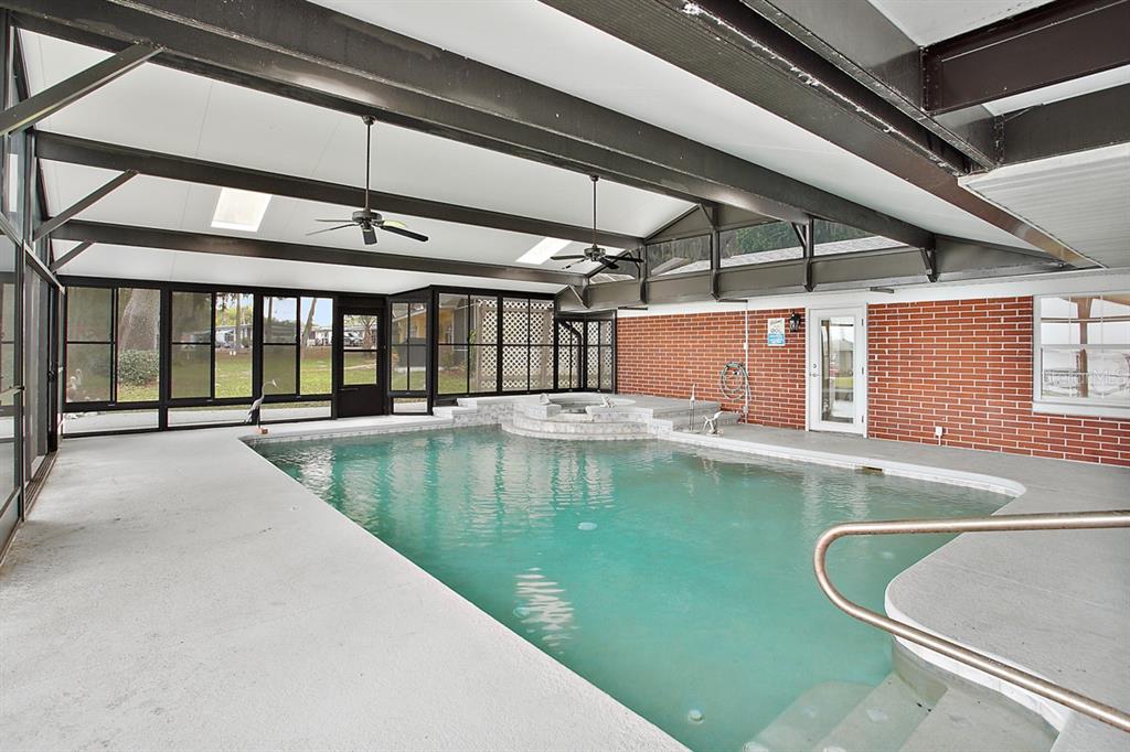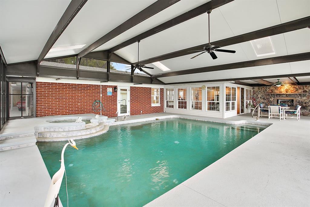 Calling all Boaters and Entertainers! Come watch the sun rise over Lake Griffin at your 2 bedroom 2 bath Lakefront Retreat on the Harris Chain. Boasting Dual Boatlifts, an enormous enclosed pool area with spa, and almost everything new in 2017, this home is a find. Walking in, you will be greeted by open, flowing living areas, panoramic lake views, and natural light pouring in over matching vinyl plank flooring throughout the bulk of the home. The kitchen has custom built Alder wood cabinets with slide out drawers and spice racks along with countertop and interior cabinet lighting. A huge island is perfect for entertaining, food prep or just extra seating. To the rear of the open kitchen is a large family room addition with recessed lighting and tons of windows to let in the outside living area and lake views. The master bedroom lies at the end of the South side of the home and shares pool / lake views with the guest bedroom just before. The master bedroom also hosts a private office with sliding rear exit and a utility room just off of that. Just outside is a Huge outdoor living space with fireplace. A large screen room with vinyl sliding windows is covered by insulated aluminum panels with skylights all over a large in ground pool with spa connected. This leads up to a 21’x15′ screened rooftop patio that gives phenomenal lake and sunrise views. Other bonuses include a detached two car garage, large circular driveway, new fence in ’22 on the North side of property, new roof and on demand water heater in 2017. The Ocklawaha River is just at the North Tip of Lake Griffin and can be taken to Silver Springs, St Johns, The Atlantic Ocean, and Lake Harris is a short boat ride through Haines Creek and the locks to the East. Great central Leesburg location and only a short car ride to The Villages, I-75, LRMC and downtown Leesburg. Come take a look today while this lasts!