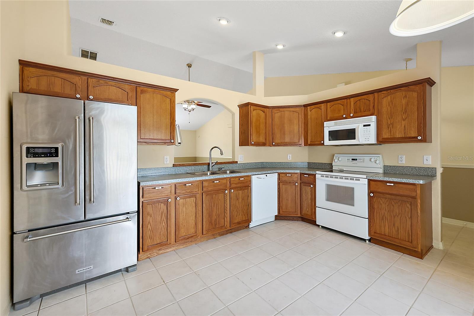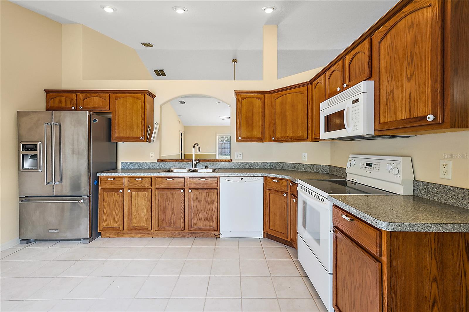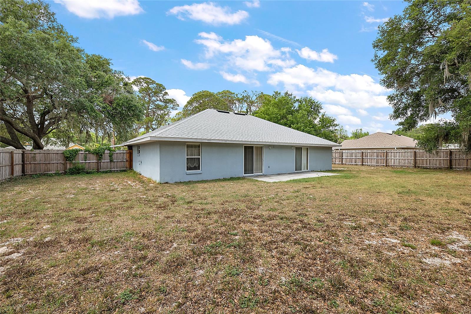 Welcome to your new home in Sun Eden, a no HOA community in Yalaha! This 3 bedroom 2 bath home sits on just about 1/3rd acre and boasts a New Roof in 2020, new wooden privacy fence at the end of 2019, and fresh paint throughout the interior, here in 2023! Walking in, you will notice tile floors throughout the living space under open, cathedral ceilings. A large eat in Kitchen sits off to the front of a Large open living area that nicely splits off the Master and guest bedrooms. The master bedroom is equipped with a large walk in in closet, tiled in shower and its own rear exit via sliding glass doors. Walking outside, the fenced in rear yard has a concrete pad for grilling and entertaining or would be perfect to convert into a screened lanai! A well maintained shed sits at the rear of the property as well for bonus storage. Other pluses include a Generator hookup, water softener system and garage workshop cabinetry. Come take a look today while this property lasts!