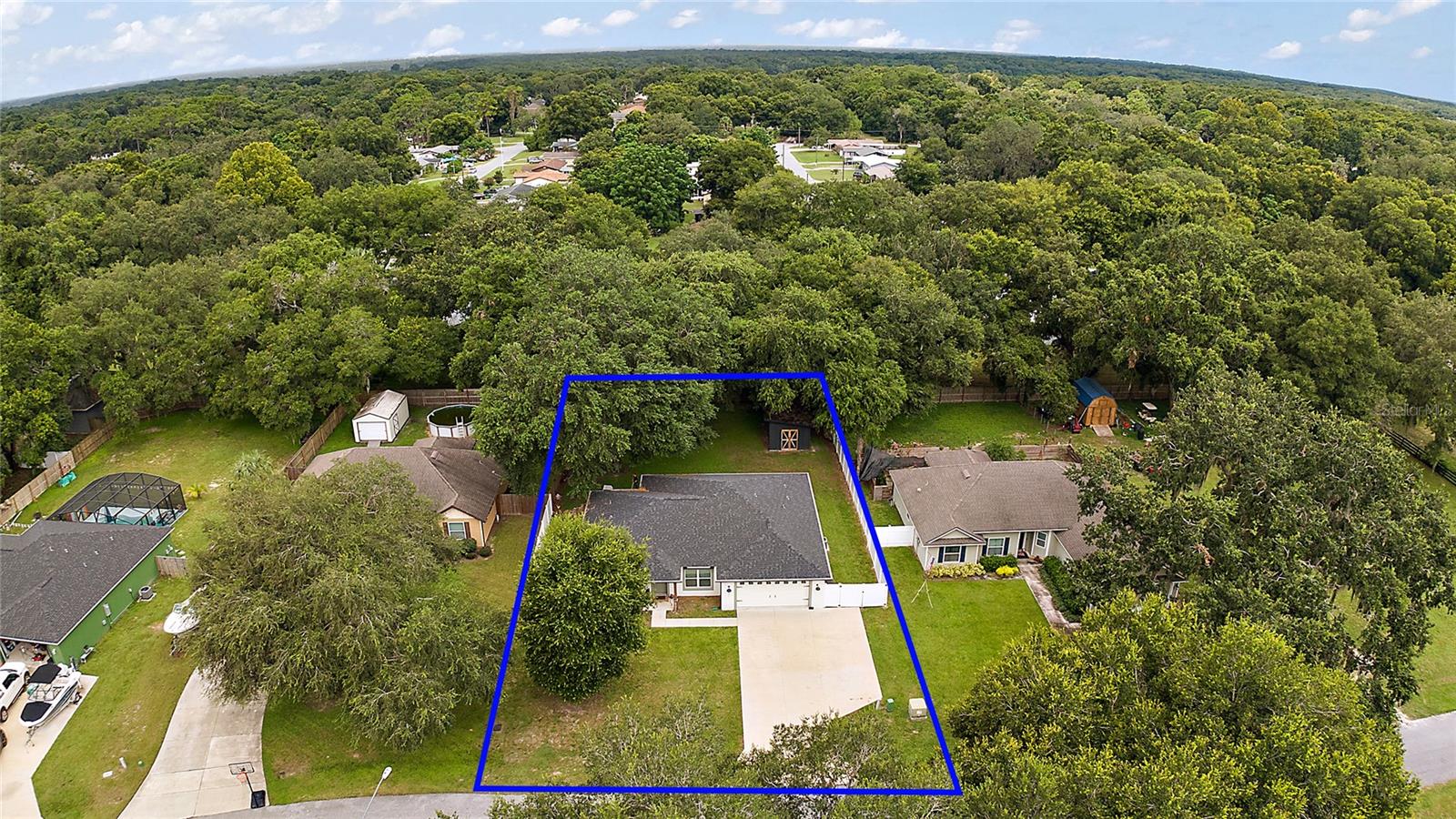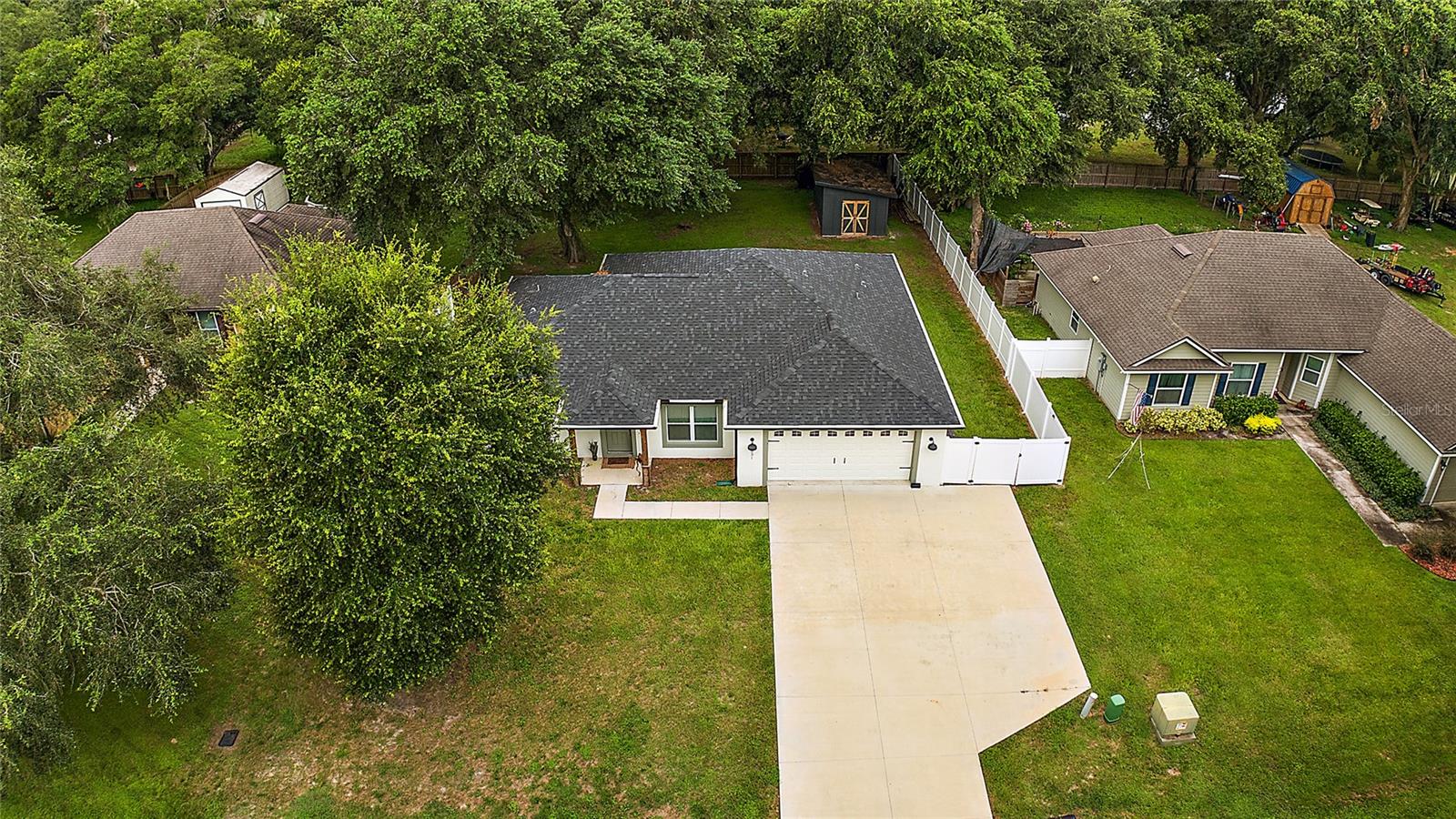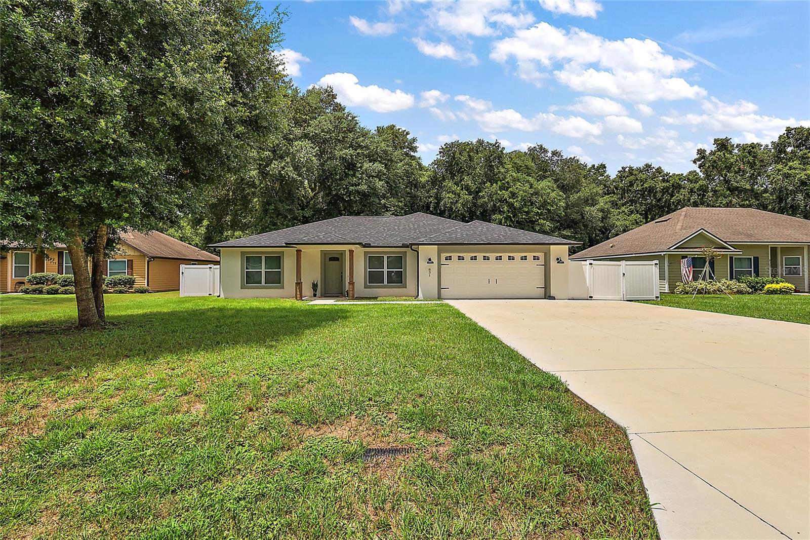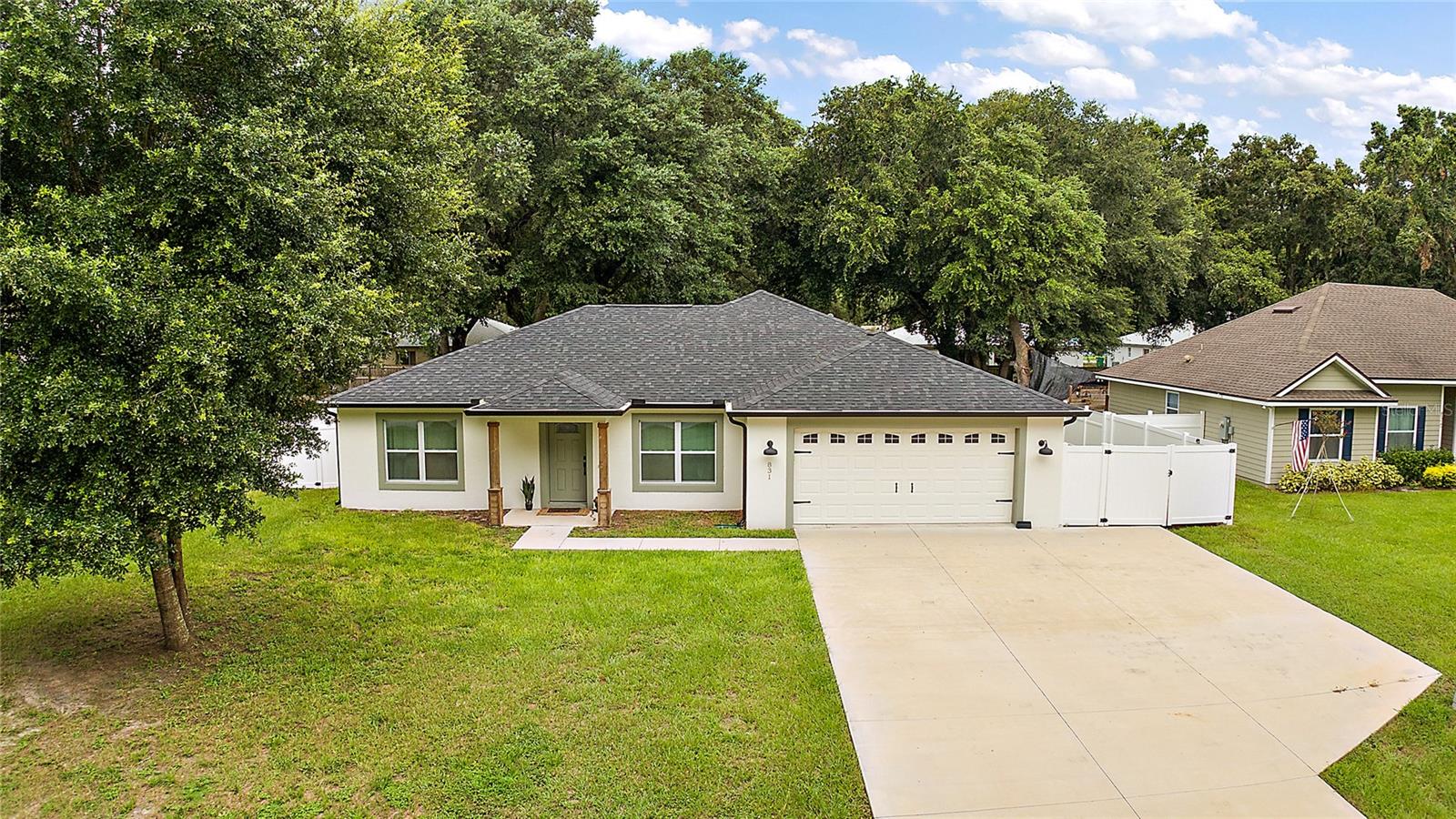 Looking for a newer construction home with NO HOA FEES and the freedom to park your boat, trailer or RV? Come take a look at this almost brand new, 2022 construction home on 1/3 of an acre in Fruitland Park! Located in a small, quiet subdivision, this home was built with tons of upgrades. When you pull up you will notice the oversized driveway and parking pad, double gate on the PVC fence, and custom wood wrapped beams welcoming you to the front porch. Walking in you will feel at home under vaulted ceilings and luxury vinyl plank flooring throughout the open living area. An open, eat in kitchen with Quartz countertops plus a breakfast bar and dining area tie the spaces together. Glass tile backsplash is a plus and custom craftsman style cabinet moldings match the rest of the homes trim. The large master bedroom boasts a walk in closet and a custom bathroom with a luxury tiled shower along with his and her sink stations. The guest bedroom are split off nicely. Outside, you have a fully fenced yard with an oversized 18×32 concrete patio, 18×9 of that covered. A large custom built shed (12×20) is also a plus on a concrete pad for your yard equipment or future outdoor flex space (man-cave or she-shed). Come take a look today while this home lasts!