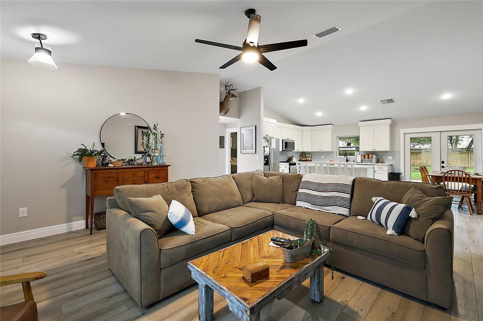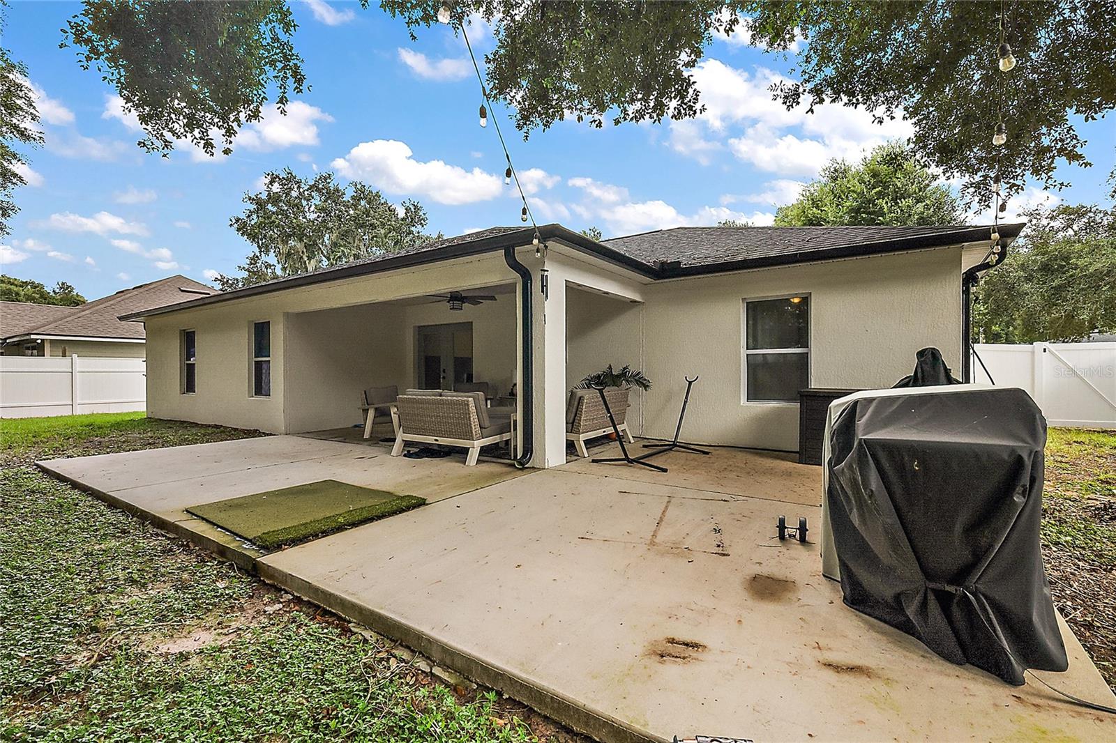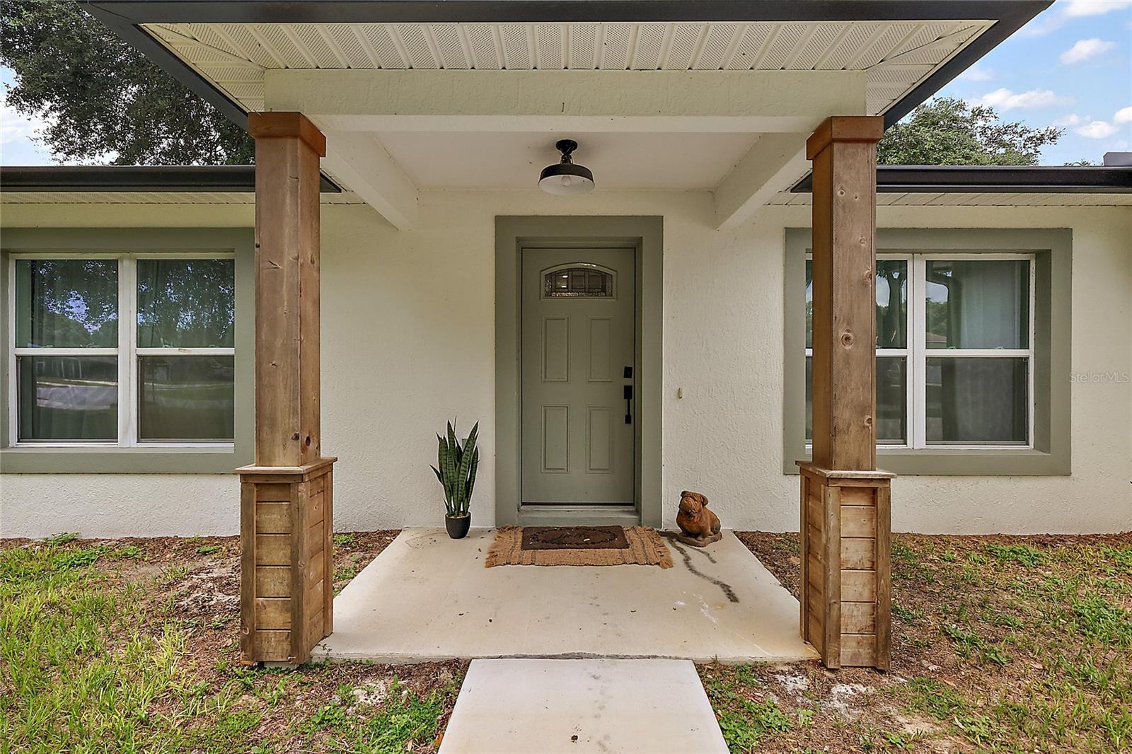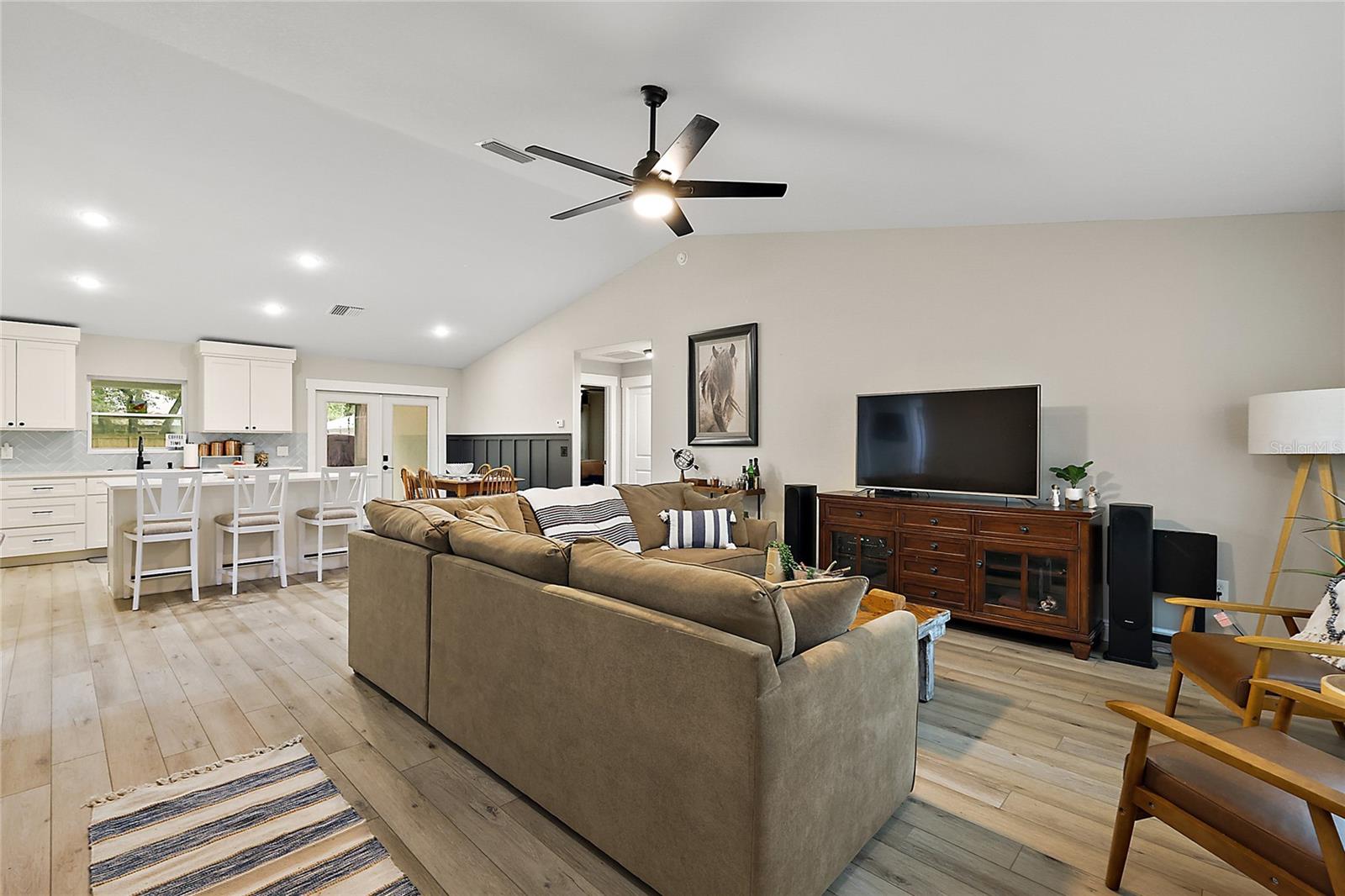 Looking for a newer construction home with NO HOA FEES and the freedom to park your boat, trailer or RV? Come take a look at this almost brand new, 2022 construction home on 1/3 of an acre in Fruitland Park! Located in a small, quiet subdivision, this home was built with tons of upgrades. When you pull up you will notice the oversized driveway and parking pad, double gate on the PVC fence, and custom wood wrapped beams welcoming you to the front porch. Walking in you will feel at home under vaulted ceilings and luxury vinyl plank flooring throughout the open living area. An open, eat in kitchen with Quartz countertops plus a breakfast bar and dining area tie the spaces together. Glass tile backsplash is a plus and custom craftsman style cabinet moldings match the rest of the homes trim. The large master bedroom boasts a walk in closet and a custom bathroom with a luxury tiled shower along with his and her sink stations. The guest bedroom are split off nicely. Outside, you have a fully fenced yard with an oversized 18×32 concrete patio, 18×9 of that covered. A large custom built shed (12×20) is also a plus on a concrete pad for your yard equipment or future outdoor flex space (man-cave or she-shed). Come take a look today while this home lasts!