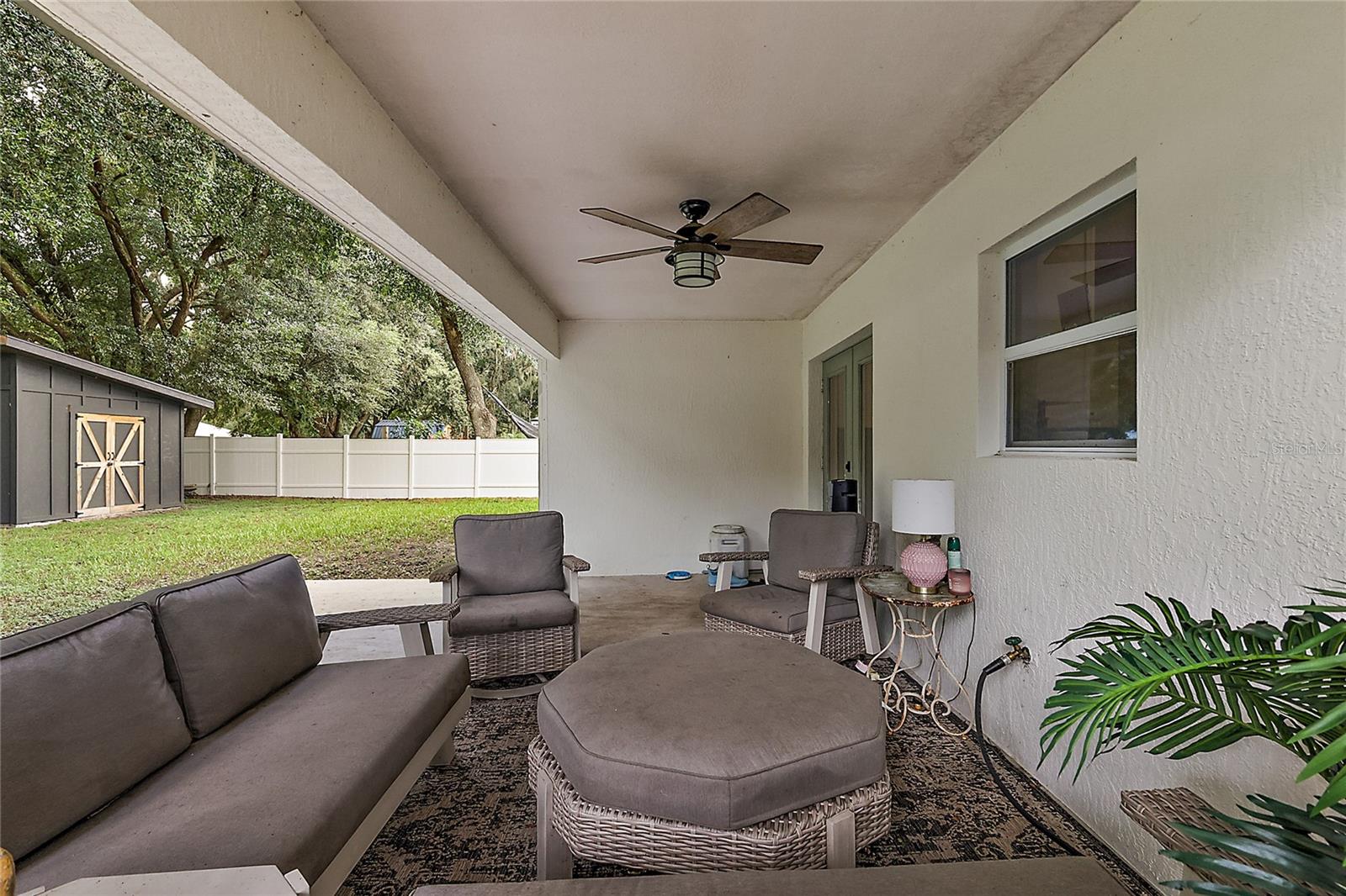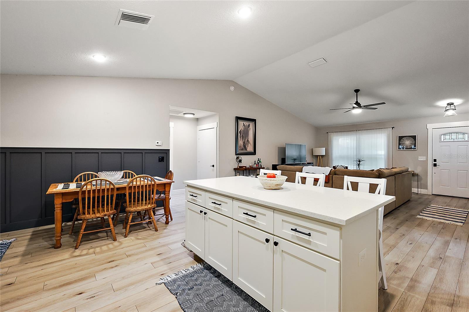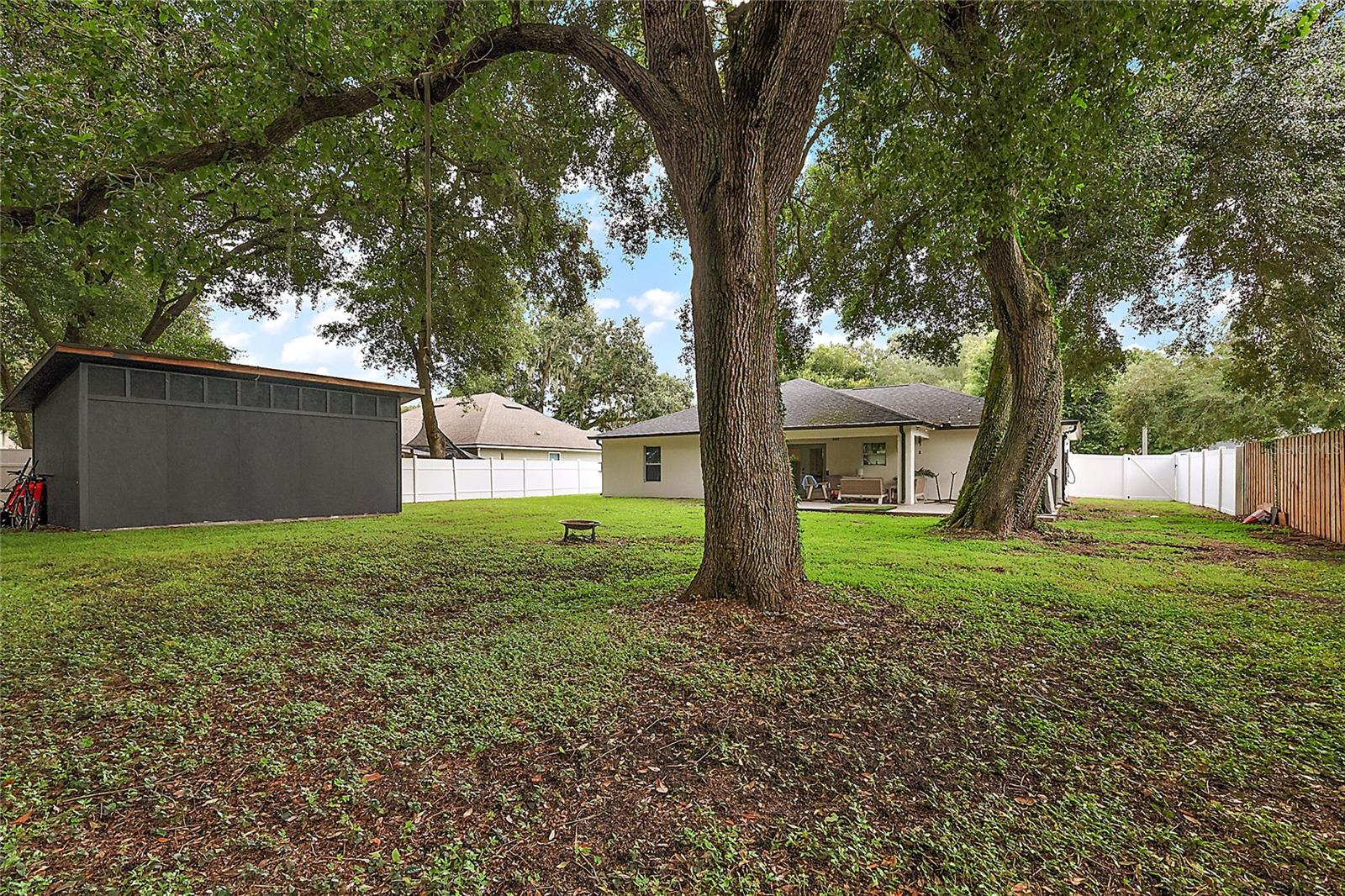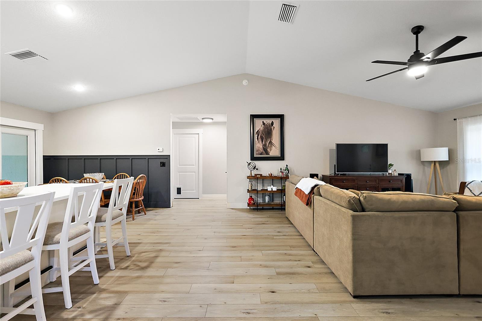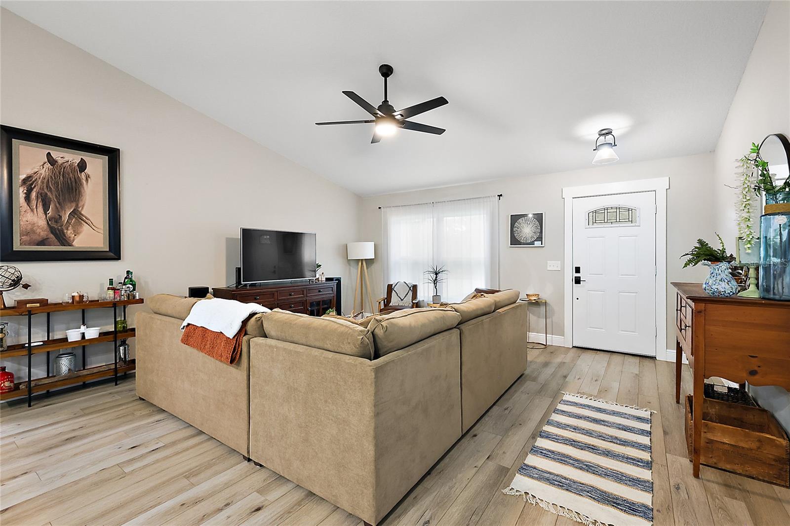 Looking for a newer construction home with NO HOA FEES and the freedom to park your boat, trailer or RV? Come take a look at this almost brand new, 2022 construction home on 1/3 of an acre in Fruitland Park! Located in a small, quiet subdivision, this home was built with tons of upgrades. When you pull up you will notice the oversized driveway and parking pad, double gate on the PVC fence, and custom wood wrapped beams welcoming you to the front porch. Walking in you will feel at home under vaulted ceilings and luxury vinyl plank flooring throughout the open living area. An open, eat in kitchen with Quartz countertops plus a breakfast bar and dining area tie the spaces together. Glass tile backsplash is a plus and custom craftsman style cabinet moldings match the rest of the homes trim. The large master bedroom boasts a walk in closet and a custom bathroom with a luxury tiled shower along with his and her sink stations. The guest bedroom are split off nicely. Outside, you have a fully fenced yard with an oversized 18×32 concrete patio, 18×9 of that covered. A large custom built shed (12×20) is also a plus on a concrete pad for your yard equipment or future outdoor flex space (man-cave or she-shed). Come take a look today while this home lasts!