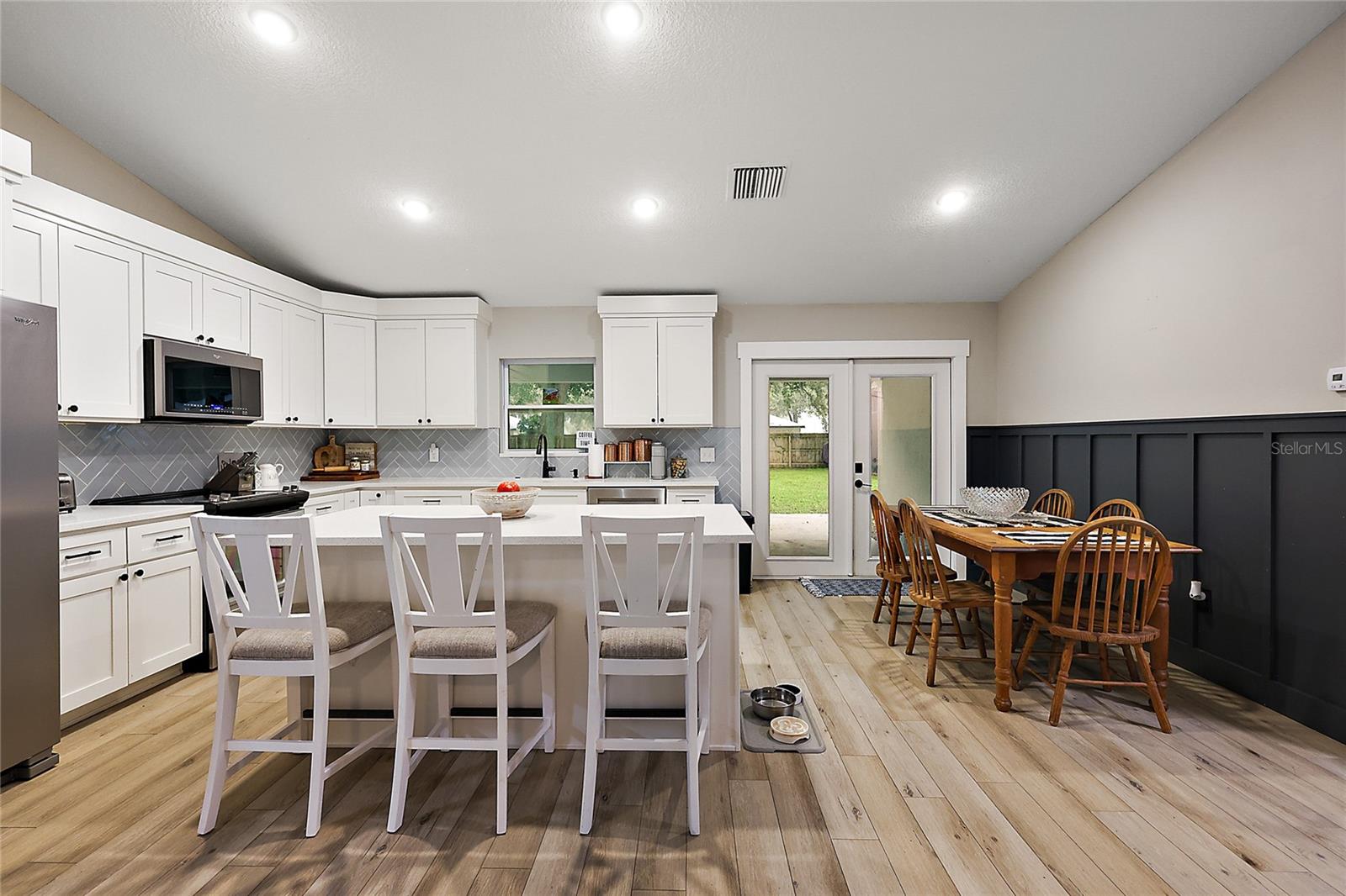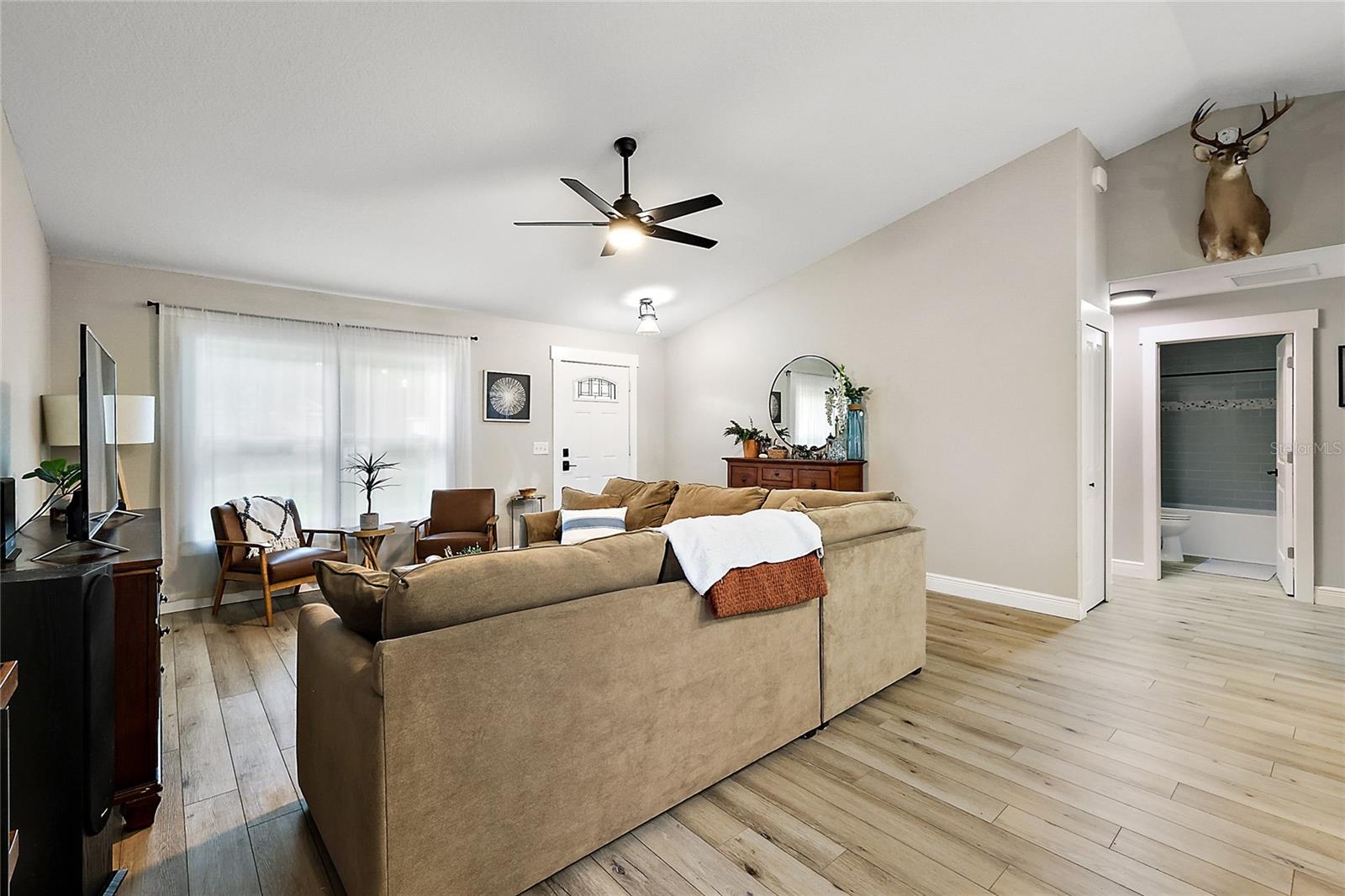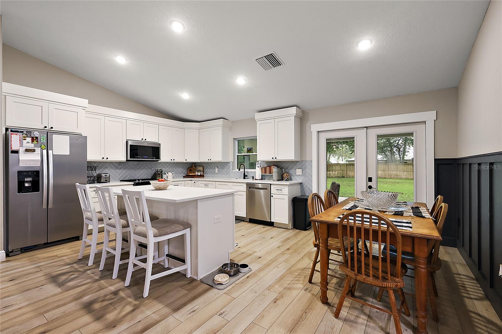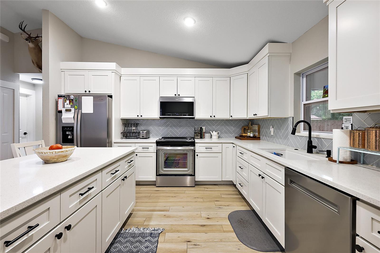 Looking for a newer construction home with NO HOA FEES and the freedom to park your boat, trailer or RV? Come take a look at this almost brand new, 2022 construction home on 1/3 of an acre in Fruitland Park! Located in a small, quiet subdivision, this home was built with tons of upgrades. When you pull up you will notice the oversized driveway and parking pad, double gate on the PVC fence, and custom wood wrapped beams welcoming you to the front porch. Walking in you will feel at home under vaulted ceilings and luxury vinyl plank flooring throughout the open living area. An open, eat in kitchen with Quartz countertops plus a breakfast bar and dining area tie the spaces together. Glass tile backsplash is a plus and custom craftsman style cabinet moldings match the rest of the homes trim. The large master bedroom boasts a walk in closet and a custom bathroom with a luxury tiled shower along with his and her sink stations. The guest bedroom are split off nicely. Outside, you have a fully fenced yard with an oversized 18×32 concrete patio, 18×9 of that covered. A large custom built shed (12×20) is also a plus on a concrete pad for your yard equipment or future outdoor flex space (man-cave or she-shed). Come take a look today while this home lasts!