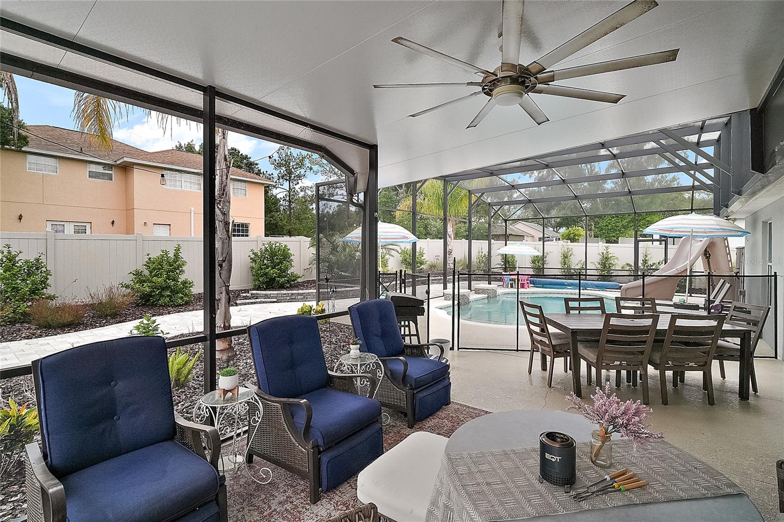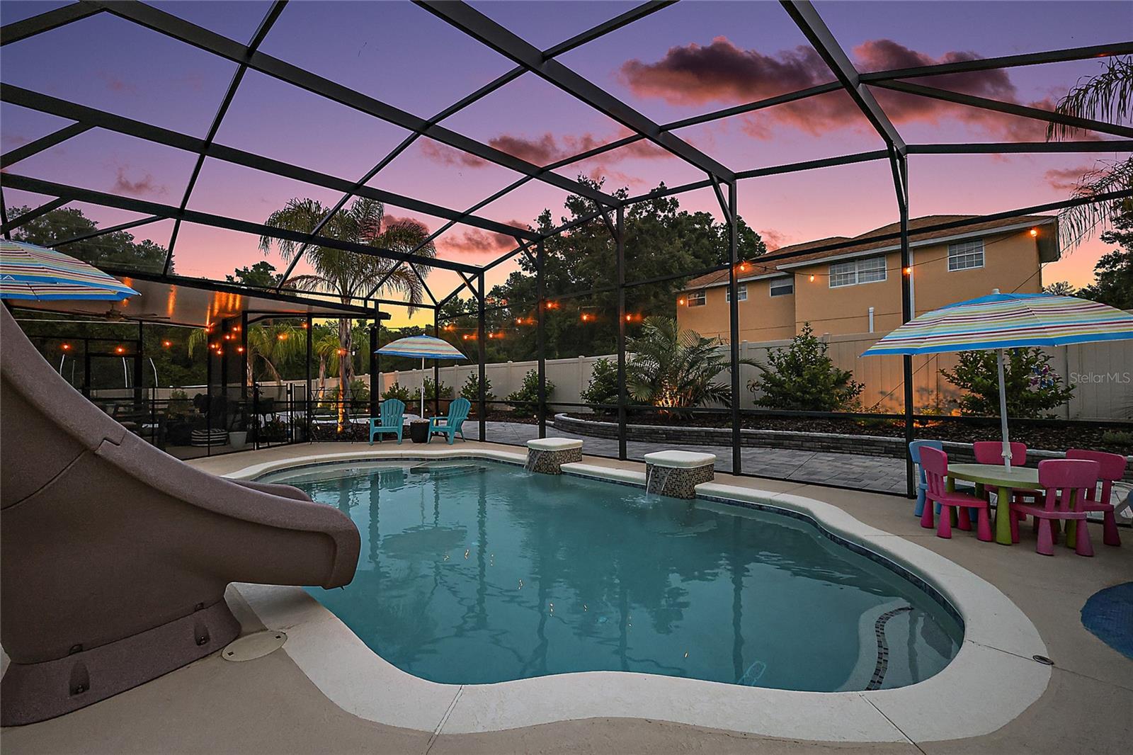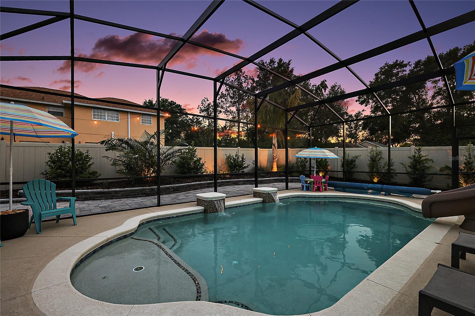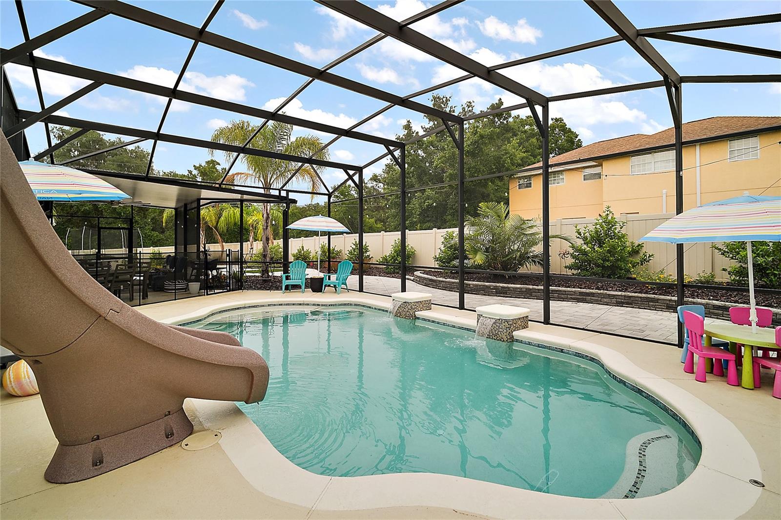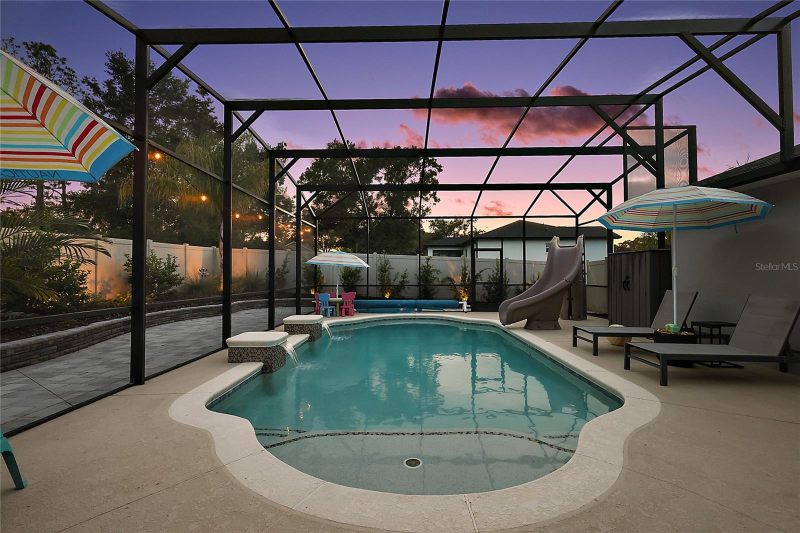 Looking for a pool home with a resort feel? Look no further! This 2018 construction block home is everything you could want at an amazing price! Pulling up to this ranch style home, you will notice a large corner lot, 2 car garage, Hardy Board siding used selectively to give you that country feel along with a screened in front 5’x35′ porch! Walking in, you area greeted with an open floorplan and vaulted ceilings. A large open kitchen with upgraded Samsung appliances hosts an eat in dinette, dedicated pantry and a breakfast bar to enjoy the open plan. The bedrooms are split nicely with the Primary Suite being on the East side of the home and the guests on the West. The primary suite features a walk in closet (currently used as a small nursery) along with a built in wardrobe and a large master bath with a beautifully tiled walk in shower. To the rear of the home, you have a huge 21’x14′ screened in seating area overlooking your exquisitely hardscaped back yard and resort style Grecian pool. Over $70,000 went into clearing, hardscaping, lighting and landscaping this amazing area, all enclosed with a Vinyl Privacy Fence. The pool is 14’x28′ and features solar heat, 2 water falls, a Typhoon slide with water control on the slide, wifi enabled color changing lights and ‘light shows’ and a sun shelf with umbrella holder for lounging in the pool or playing with the kiddos. Located just a block from 466 and Snooky Park and 5 minutes to the villages Square at Spanish Springs. Come take a look today while this entertainers dream / family home lasts!